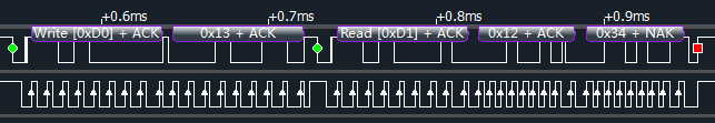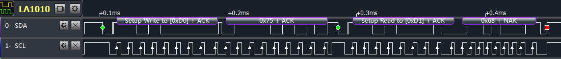 过程2开始给从机发送寄存器地址,从11到18,数据为01110101b,即0x75,是WHO_AM_I寄存器的地址。