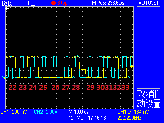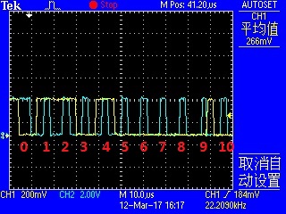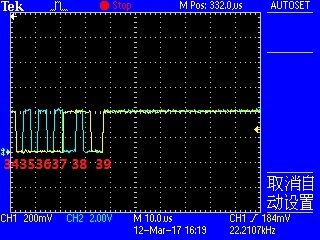 这几幅图象是使用STM32单片机使用IIC读取MPU6050的ID号的过程。,黄色线代表SDA,蓝色线代表SCL。